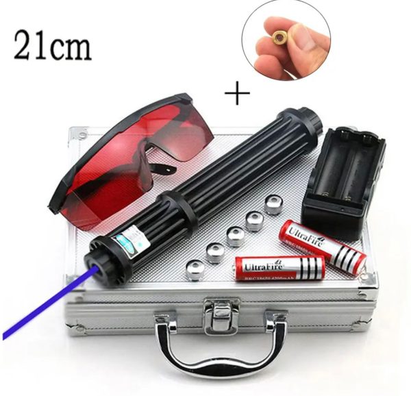 מצביע לייזר כחול עשוי מסגסוגת אלומיניום חזקה ועמידה מגיע עם קופסא לנשיאה, משקפי מגן, מטען לסוללות ו5 ראשי ללייזר